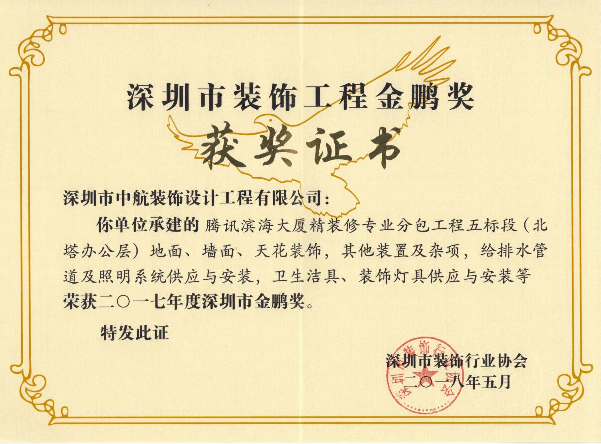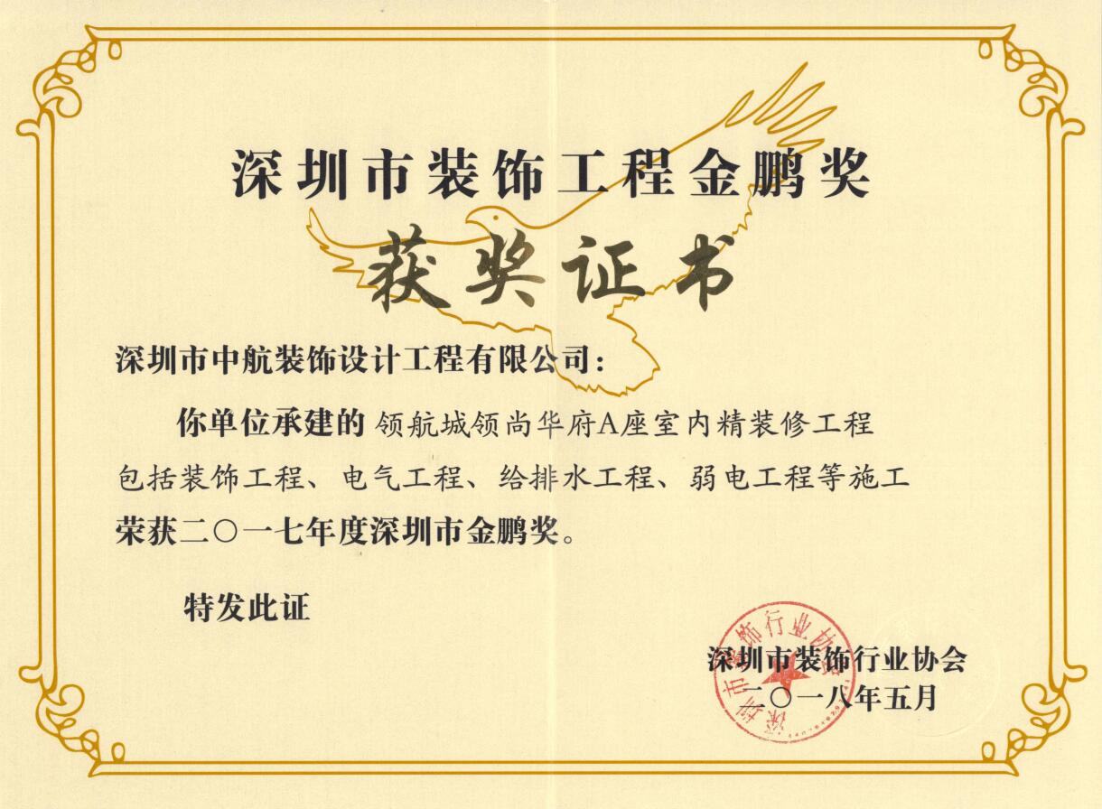 熱烈祝賀中航裝飾再獲多項深圳市裝飾工程“金鵬獎”
