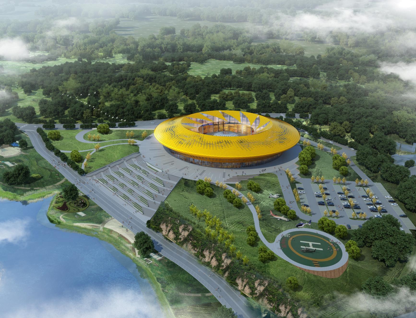 淮州新城國際會展中心采用圓形作為基本形體,通過透明玻璃幕墻從底部托起,營造出建筑整體懸浮半空的姿態(tài),形似“UFO”飛行器。主要分為展覽中心、會議中心、航空博物館和設備用房及庫房等輔助功能區(qū)三部分功能分區(qū)。一層為展廳,服務于未來航空產(chǎn)業(yè)產(chǎn)品的展覽,二三層為會議功能區(qū),服務于大型航空產(chǎn)業(yè)會議的召開,四層為航天博物館。未來,淮州新城國際會展中心將成為淮州新城通用航空產(chǎn)業(yè)對外展示的窗口。