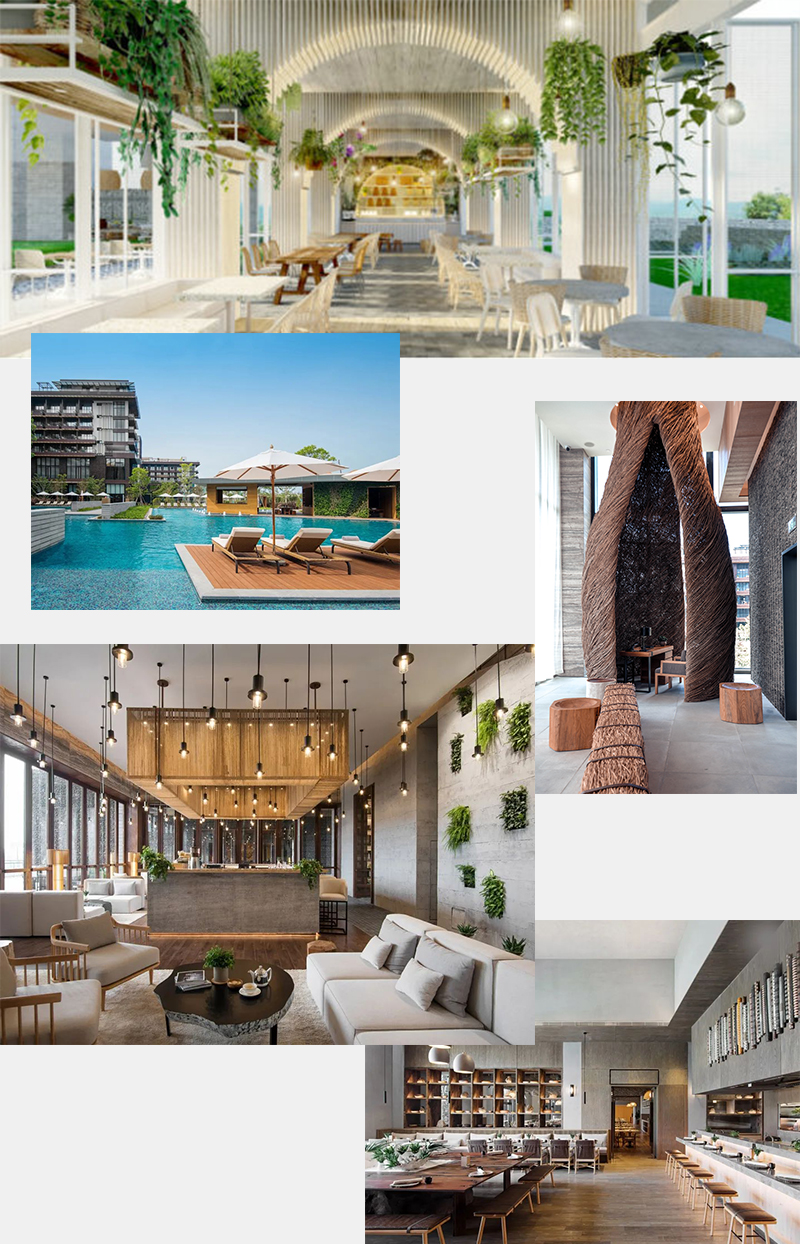 ? ? ? ?建筑風格同酒店定位相匹配,突出生態環保、回歸自然的樸素理念,通過體型的轉折變化,打造形態錯落、步移景異的建筑群落。外立面設計受到海南當地傳統建筑的啟發,并融合被動式環境設計策略,項目形態錯落有致、返樸歸真,通過一系列遮陽和融合建構的景觀綠化設計,使得空間層次豐富,光影變化細膩,富于體驗感。立面結合暖色木料和耐候金屬,與源自本地的火山石材等天然物料融合,表達出質樸自然的多樣氛圍。