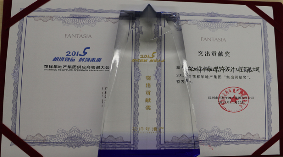 ? ? 11月22日,花樣年地產集團2015年“相攜致遠,創(chuàng)領未來”供應商答謝大會隆重舉行。花樣年地產集團的眾多合作單位與供應商代表齊赴盛會,共享成功喜悅!中航裝飾集團董事長石英、總經理孫玉東受邀出席大會,敘友情、話合作、謀發(fā)展,并一舉榮獲本次盛會最重要的獎項“花樣年地產集團2015年度突出貢獻獎”。