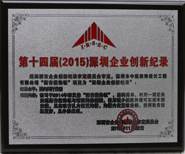 ? ? 2016年1月8日,第十四屆深圳企業(yè)創(chuàng)新記錄成果發(fā)布會在五洲賓館舉行。大會共審定“深圳企業(yè)創(chuàng)新記錄”147項,其中由我公司自主研發(fā)的“隔音裝飾板”項目和“一體化建筑節(jié)能智能化中央管控系統(tǒng)”項目紛紛獲獎。
