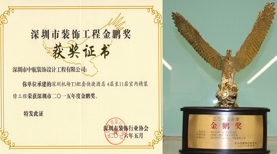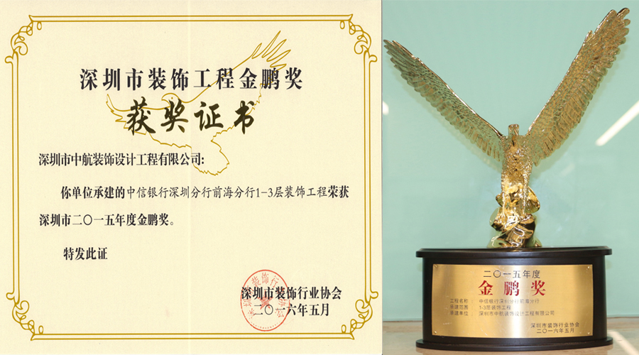? ??多年來,中航裝飾集團不斷強化專業(yè)技術工藝,工程質量和工程品質穩(wěn)步提升。中航裝飾注重品牌建設,更注重品質建設,我們堅信只有提升品質,才能增創(chuàng)效益。深圳市裝飾工程金鵬獎是深圳裝飾工程領域的權威評選,這份榮譽的獲得是業(yè)界專家對我公司裝飾裝修工程優(yōu)秀品質的充分認可。我們珍惜這份榮譽的獲得,更希望將這份榮譽載入中航裝飾的史冊,使之延續(xù)并發(fā)揚光大!
